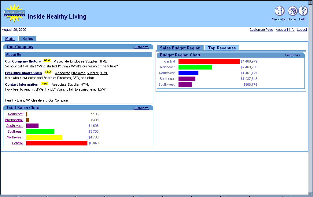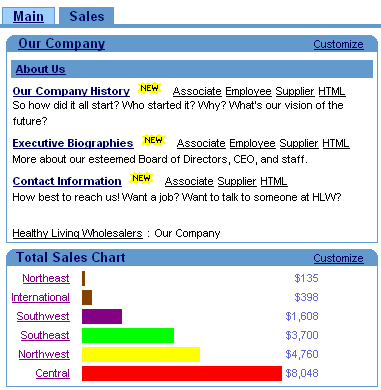 This chapter describes how to use Oracle Portal to build a portal for a Sales department within the Healthy Living Company intranet. You will create components and pages to make it easy for Healthy Living salespeople to access their customer database, quickly browse product information, and update their own sales information. They will also be able to view their monthly quotas and commission standings relative to the other salespeople in the company.