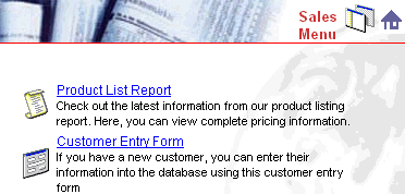 In this section, you will create a menu with links to the Product Report and Customer Entry Form you created in this chapter. This menu uses the links you created in Section 3.8.1, "Create two links for your menu".