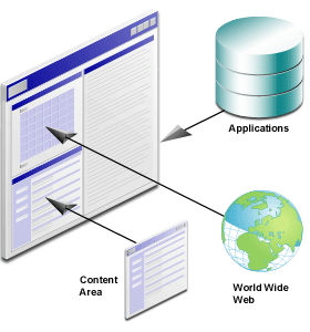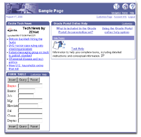 together under a common interface, thus providing a single point of interaction. How does Oracle Portal do this? By bridging the largely disconnected worlds of dynamic data, documents, and Web sites through the use of portlets. A portlet is an area on a page that contains data from a particular data source. For example, your page might contain an application that you use frequently in one portlet, stock quotes for your investments right next to it in another portlet, and a standard corporate navigation bar running along the bottom. You can create your own portlets using Oracle Portal Development Kit, or take advantage of the extensive portlet library shipped with Oracle Portal. And Oracle Portal itself allows you to create portlets quickly and easily: just by checking a box, folders, components, and even other pages instantly become portlets. Portlets appear on a Oracle Portal page. Each page is configured into regions; one or more portlets occupy each of those regions. Here is a page divided into three regions. ![]() Into each region you can place an Oracle Portal folderor just a few regions from the foldera navigation bar, items belonging to a certain category or perspective, an Oracle Portal component, or even another page. Anyone who logs on to Oracle Portal with the proper permissions can create a page. In most cases, however, the Oracle Portal administrator builds a separate page for each distinct user group that provides access to the data relevant to them. For example, a member of the Human Resources department will want to see the latest compensation data, while someone in the Financial department needs access to financial spreadsheets and applications. Everyone in the company will want to pick and choose from various corporate portlets, like a company event calendar, stock option calculator, corporate bulletin boards, and so on. How Can You Customize Your Portal?