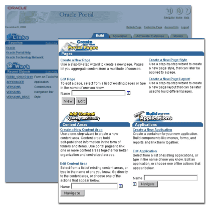Design Page The Oracle Portal design page is an entry point into the Oracle Portal design environment. This page provides quick access to all the Oracle Portal tools you need, and only those tools appropriate to your Oracle Portal role. The tools appear as portlets on the page, and are grouped into related tasks. For example, all the tools for building pages, content areas, and applications are grouped together, as are all the database administration tools. The appearance of the design page reflects your Oracle Portal roleyou only see the database administration tools if you are a database administrator. |