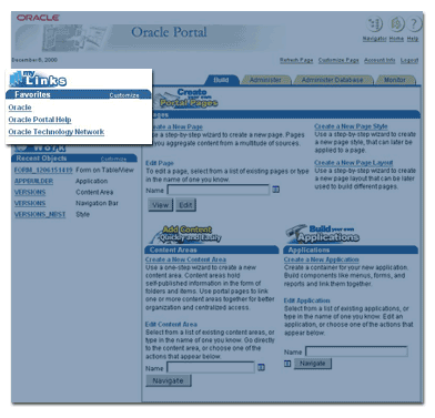 Bundled Portlets Oracle Portal provides portlets to facilitate quick navigation through the product. You can add a link to any URL that you frequently access to the Favorites portlet, so that you can reach it with a single click. The Recent Objects portlet enables you to quickly return to any object you created recently, without having to spend time finding it first. You can customize both of these portlets to list as many or as few items as you want. |