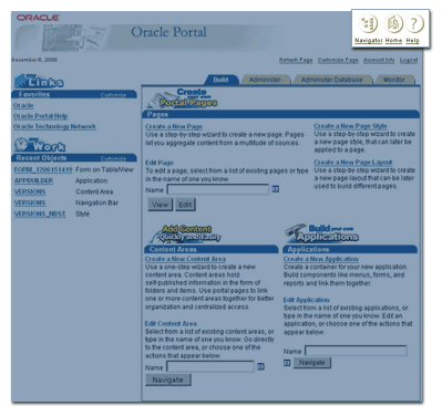Shortcut Bar The shortcut bar is displayed at the top of every Oracle Portal page, and provides quick access to some of the more frequently used Oracle Portal tools. It includes links to the Content Guide, Navigator, and Online Help, each of which is described later in this walkthrough. The shortcut bar also includes a link to return you to your home page. |