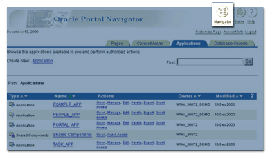 Navigator The Navigator provides access to every Oracle Portal and database object. Access the Navigator by clicking the Navigator icon in the shortcut bar. Use the Navigator to drill down to the object you are interested in. Once you have located your object, the Navigator enables you to perform actions on it, such as viewing, editing, or deleting it. The actions you are offered depend on the privileges you have for that particular object or type of object. |