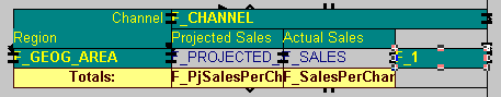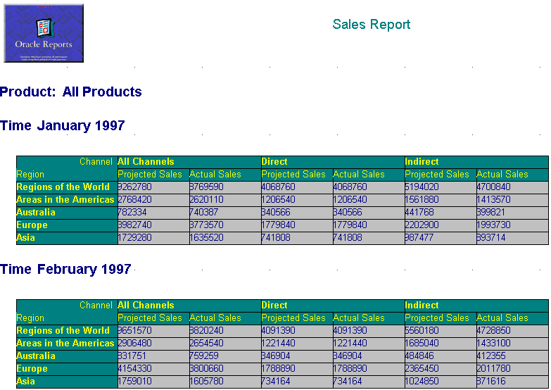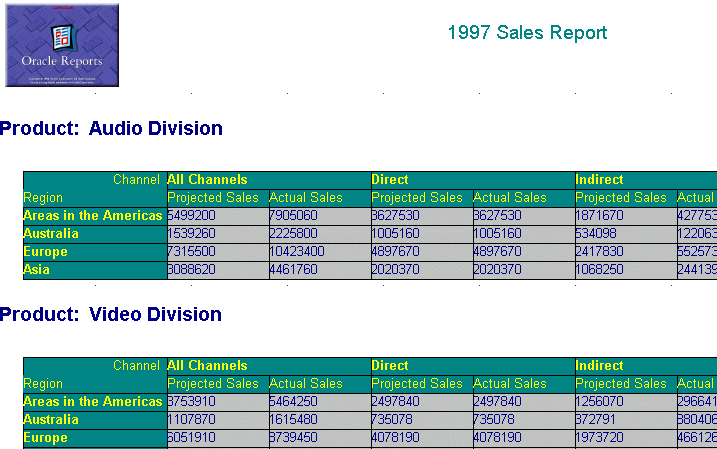 Notice the projected and actual sales. In the new report, each cell represents the yearly sales for a region and channel in a product division for 1997, while the previous report displays sales data for a region and channel in a product division for each month.