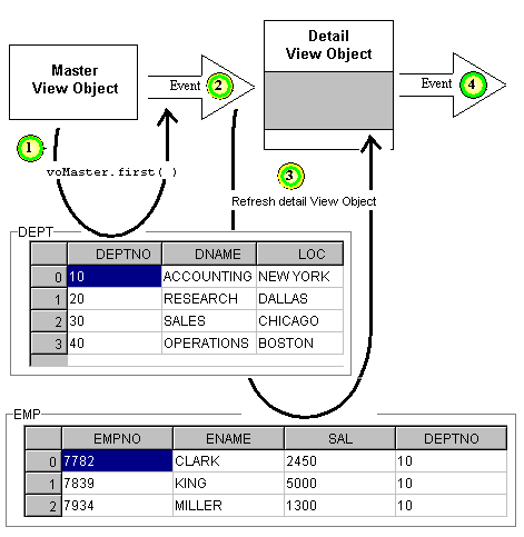 When two View Objects are linked in a master-detail relationship, the default (or first) iterator for the master View Object fires events to refresh the detail View Object. When the detail View Object is created, the Business Component for Java framework registers it as an event listener for the master's iterator. Thus, when the iterator moves to another row in the master View Object, the contents of the detail View Object are refreshed automatically, as shown in Figure 1.