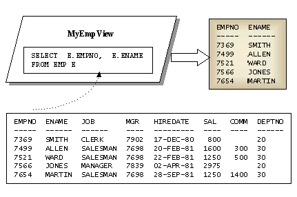 Figure 2 shows MyEmpView operating without restrictions and fetching the specified columns from every row of the EMP table.