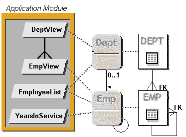 An Application Module provides a logical container for a data model represented by View Objects and View Links. Figure 1 shows an Application Module that contains four View Objects: DeptView, EmpView, EmployeeList, and YearsInService. The figure also shows the corresponding Entity Objects and the underlying tables in the database. A client application could access the four View Objects individually, but each access would require a separate trip across the network. The Application Module effectively groups or "wraps" the View Objects, enabling a client to access the entire data model (including information about the master-detail link between DeptView and EmpView) in one roundtrip.