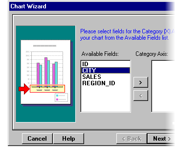 On the Category and Value pages of the wizard, specify data block items to be the Category (X) Axis and Value (Y) Axis.