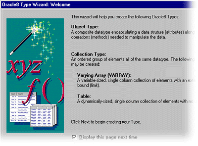 Selecting the Types node and clicking the Create button initiates the Type Wizard, which leads you through the steps necessary to create an object type or collection type.