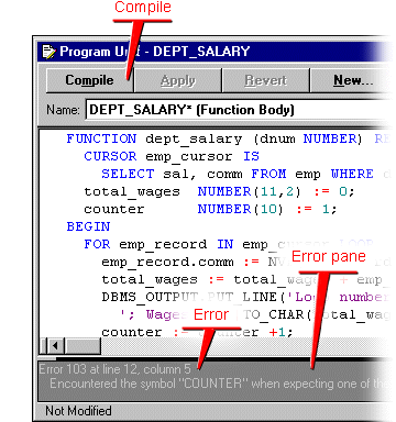 The Program Unit editor allows you to quickly apply your changes, compile program units, and troubleshoot PL/SQL syntax errors with an interactive error message pane.