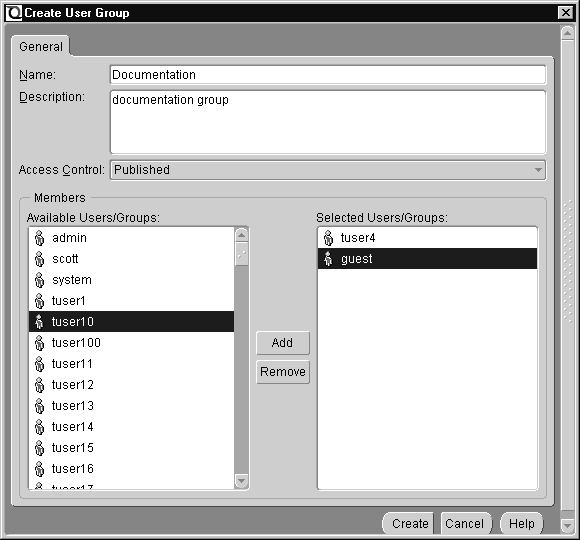 The default ACL of the user that created this group is assigned to any new group you create. Therefore, a group with the PUBLISHED ACL cannot be edited by any user. When creating groups, it is important to discuss with department managers and other users if they want all Oracle iFS users to have read-only access to the groups you are creating for their respective departments. If you need to change the default ACL, you can do so by modifying the ACL for a specific group.