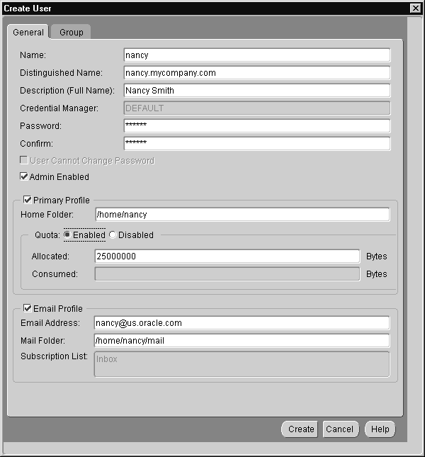 Users can be created with all the Oracle iFS administration tools. Oracle recommends that you use Oracle iFS Manager, XML, or the Web interface. These tools create all objects associated with a new users with standardized settings. Creating users involves two steps: