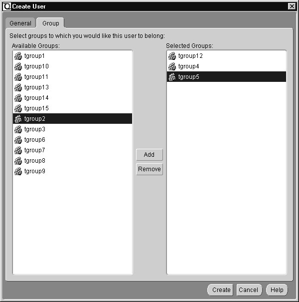 This example XML file creates groups. You can use this file, although you must modify the name of the group to match the name of the group you are creating. When adding users to the group, the user names must exist. If you use FTP or CUP to load the XML file into Oracle iFS, it is parsed and not saved anywhere in Oracle iFS.