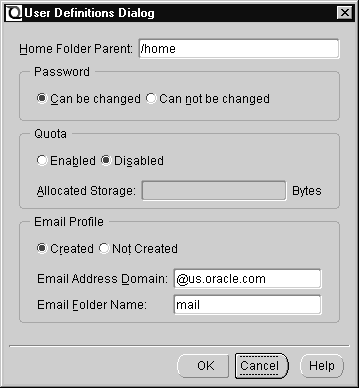 A user's home folder is the default directory where a user starts when logging into Oracle iFS. Users can use their home folder as their personal workspace and to store their private files. A user's home folder can reside anywhere, so Oracle iFS Manager provides a dialog to change the default home folder location. The Web interface creates a user's home folder as the user's login name, under the /home