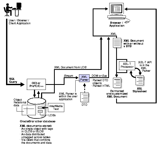 This XML data is optionally transformed by the XSLT processor, viewed directly by an XML-enabled browser, or sent for further processing to an application or AQ broker.