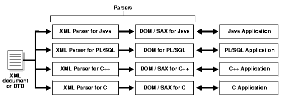 Figure 3-1 illustrates the Oracle XML Parser for Java. Figure 3-2 illustrates the Oracle XML parsers' overall functionality.