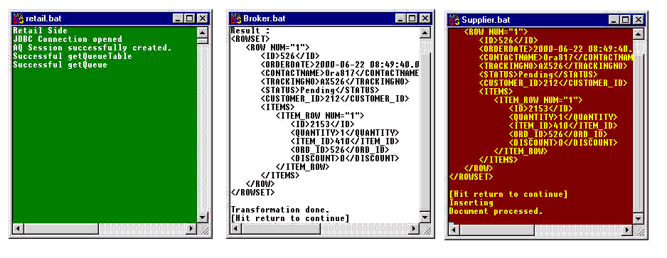 Figure 13-20 [AQ Broker]: Viewing the retailer.bat, broker.bat, and supplier.bat Consoles (3 of 3)