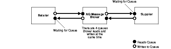 1. The Supplier waits for the queue from the AQ Broker-Transformer that a order is pending from a Retailer. The Supplier dequeues the AQ message.