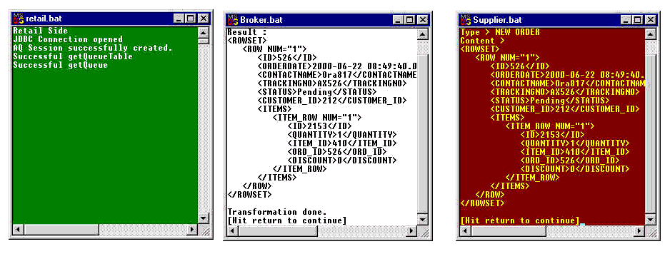 2. An XML document containing the details of your order has been produced using the XML-SQL Utility. This document has been sent to the AQ Broker-Transformer for propagation, using Advanced Queuing.