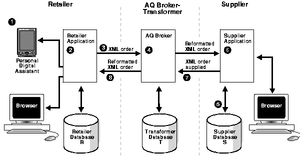 Figure 13-2 shows the main components used in this B2B XML application. The Retailer orders good from a Supplier and receives a confirmation from the Supplier that the goods have been shipped. The detailed transaction diagram of the process is illustrated in Figure 13-5.
