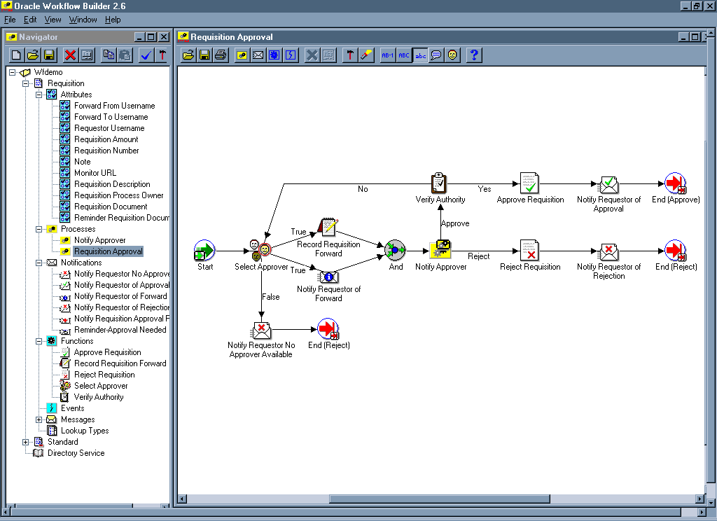 The following diagram depicts a simplified workflow process definition that routes a requisition to a manager or set of managers for approval.