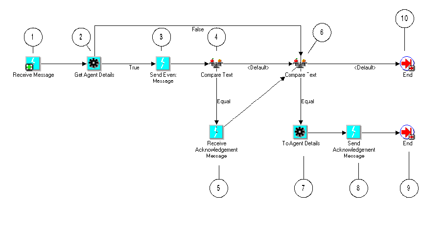 At node 6, the process determines whether it should send an acknowledgement of the original message that it received. If no acknowledgement needs to be sent, the process ends at this point. Otherwise, the process retrieves the agent details for the inbound agent where the acknowledgement must be sent and sends the acknowledgement message to that agent. Then the process ends.