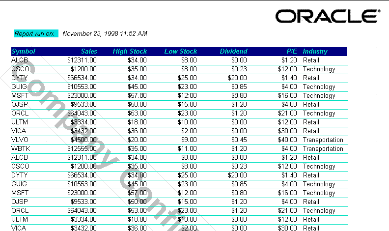 In this report example, you will build a multi-query report that summarizes stock information by company symbol using the Tabular report style. You will create a new template and apply the template to the report. Then you will enhance the template by changing several default attributes in the template margin and body. You will enhance the template further by overriding some of the default attributes of the Group Above style. Finally, you will create an additional layout using the Group Above style, and re-apply the template to the report.