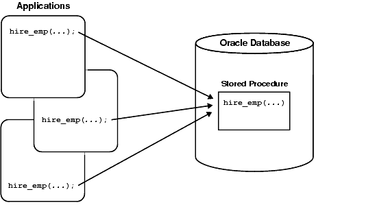 When called by client applications, a stored procedure can accept arguments, reference Java classes, and return Java result values. Figure 1-2 shows a stored procedure being called by various applications.