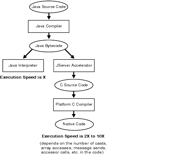 The JServer Accelerator is a native-code compiler that speeds up the execution of Java programs by eliminating interpreter overhead. It translates standard Java class files into specialized C source files that are processed by a platform-dependent C compiler into shared libraries, which the JServer JVM can load dynamically.