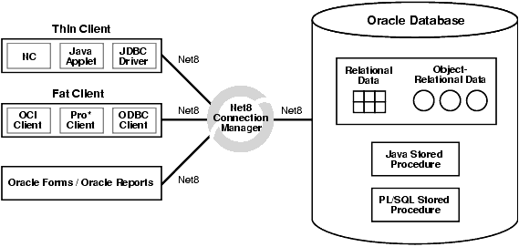 Figure 1-1 shows a traditional two-tier, client/server configuration in which clients call Java stored procedures the same way they call PL/SQL stored procedures. (PL/SQL is an advanced 4GL tightly integrated with Oracle8i.) The figure also shows how the Net8 Connection Manager can funnel many network connections into a single database connection. This enables the RDBMS to support a large number of concurrent users.