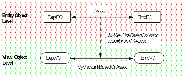For example, during design time you can define View Objects such as DeptVO for the DeptEO Entity Object, and EmpVO for the EmpEO Entity Object. Then you can define an Association named MyAssoc that associates DeptEO to EmpEO. With this information, you can build a View Link Definition, say MyViewLinkBasedOnAssoc, which relates DeptVO to EmpVO, based on this Entity Association. This relationship is illustrated below: