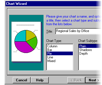 On the Type page of the wizard, enter a title, and select a type from the Chart Type pop-list. The Chart Subtype pop-list displays subtypes specific to the basic chart type you select.