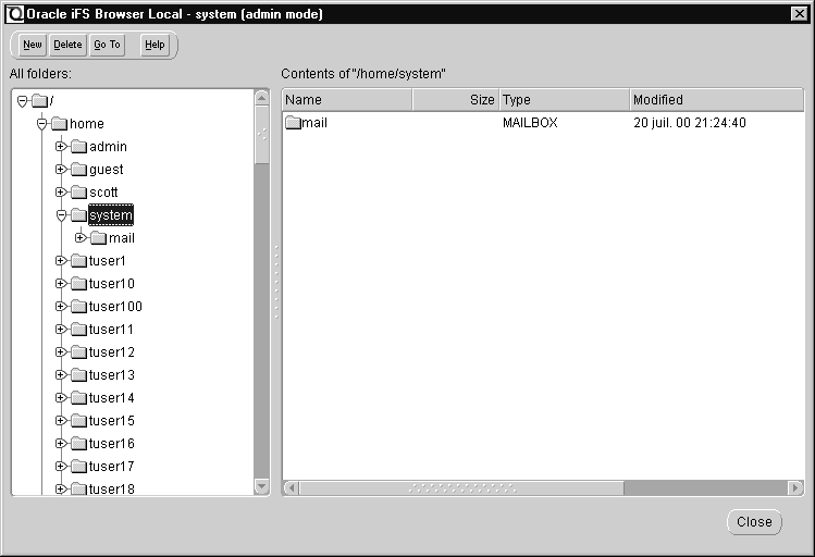 If you select Browse from the File menu, Oracle iFS Manager displays a window showing the folder hierarchy of the connected Oracle iFS instance. The browser consists of a Navigator and a toolbar that lets you create a new directory, delete a directory, and go to a specific directory. To the right of the Navigator, Oracle iFS Manager displays the attributes of folders as you select them in the Navigator. The Browser provides: