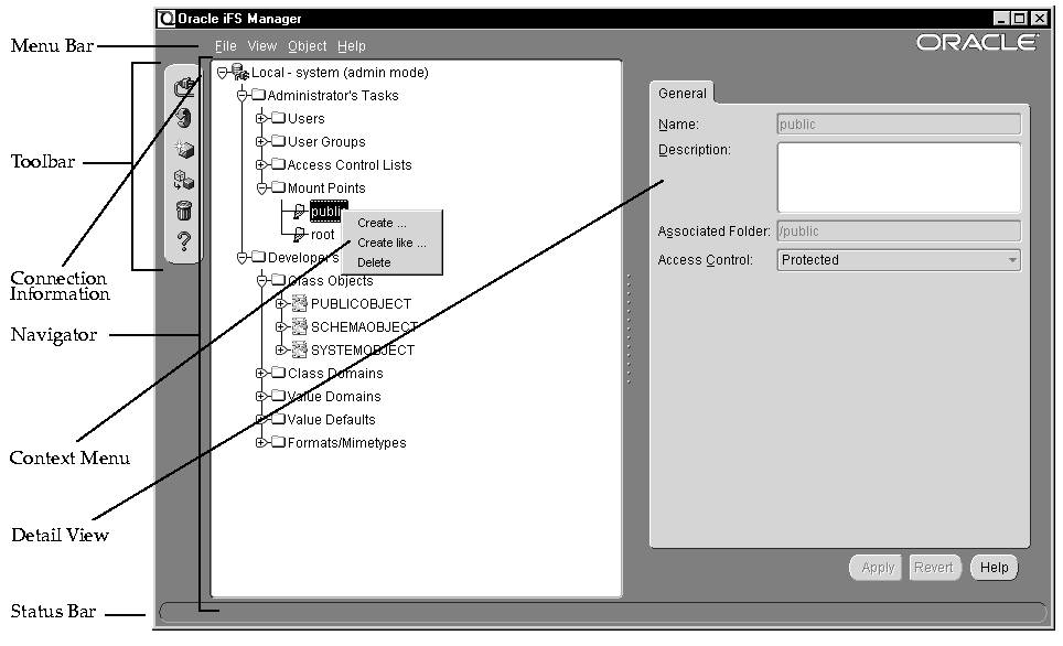 The main Oracle iFS Manager window has the following parts: