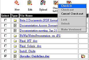 You can edit the file in place or modify a copy of the file locally. While a file is checked out, that particular file cannot be updated or deleted by anyone else. When you finish modifying the file, you check it in, making the revised version available again to other users. When the file is ready for publication, you can lock the file preventing everyone, including the owner of the file, from making any further changes. |