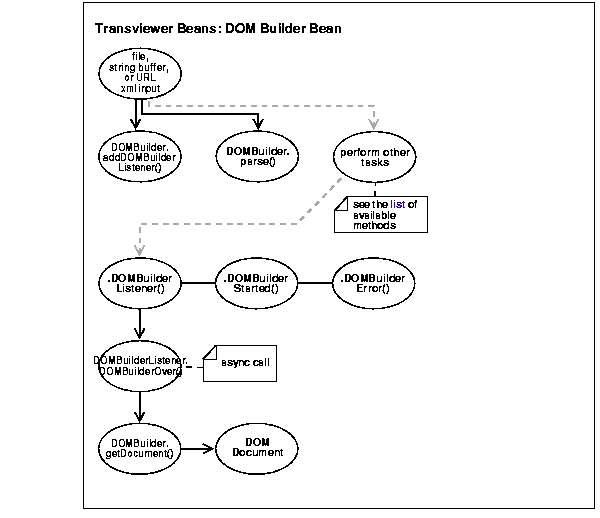 DOM Builder Bean encapsulates XML Parser for Java with a bean interface. It extends its functionality to permit asynchronous parsing. By registering a listener, a Java application can parse documents and return control return to the caller.