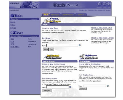 Design Page The Oracle Portal design page is an entry point into the Oracle Portal design environment. This page provides quick access to all the Oracle Portal tools you need, and only those tools appropriate to your Oracle Portal role. The tools appear as portlets on the page, and are grouped into related tasks. For example, all the tools for building pages, content areas, and applications are grouped together, as are all the database administration tools. The appearance of the design page reflects your Oracle Portal roleyou only see the database administration tools if you are a database administrator. |
