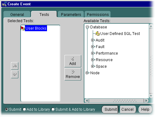 If you are creating an unsolicited event, you add the generic Unsolicited Event test to the selected test list as many times as needed. Enterprise Manager's optional Diagnostics Pack includes additional tests that expand the capabilities of the Event Management System. |