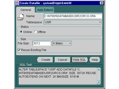 I choose one of the datafiles in the tablespace, right-click on it, select Create Like from the pop-up menu, fill in the datafile name, and increment the file number by 1. Create Like fills in all parameters except the datafile name to match the other file. Before creating the datafile, I review the SQL to be executed, as a sanity check. |