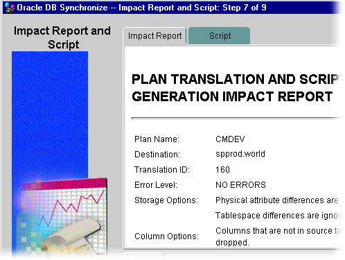 The Synchronization Wizard generates a script to reproduce the definitions at the production database. The Synchronization Wizard takes the structure of a production database into account before generating a script, and generates an impact report to alert you about possible problems in executing the task. |