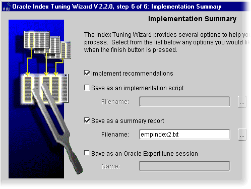In the final step of the Index Tuning Wizard, you can select any or all of the implementation options. Saving the index analysis as an Oracle Expert tune session allows you to customize the index analysis by modifying the index tuning rule parameters through Oracle Expert. Click Finish to end the current index tuning session and execute the selected implementation options. |