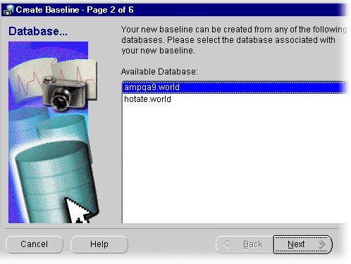 In the second step, the Create Baseline wizard displays a list of available databases. The list consists of all databases available to the Enterprise Manager Console with your current login.