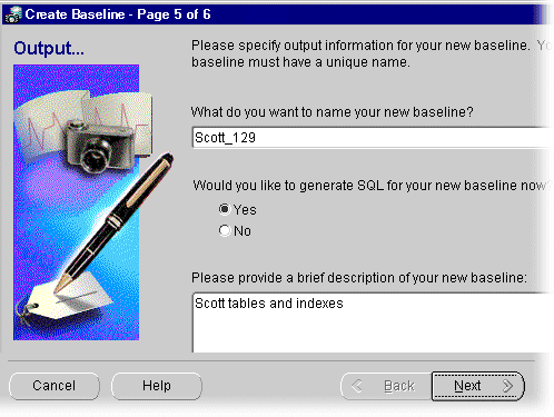 When you complete the Capture process, the baseline will be stored under the name you enter in this step. You may want to embed version number information into the name. You can also use the description area to document the baseline. You also have the option to generate SQL for the baseline. Choosing No speeds up the capture processyou can generate SQL later if you want to use the baseline to modify object definitions. |