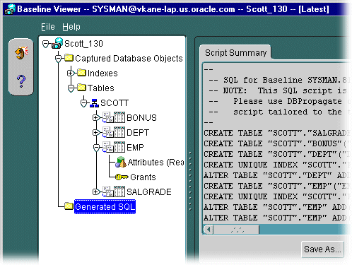 When you view the baseline's SQL code, you have the option to save the baseline as a SQL DDL file. You can then use the file to create the definitions in a new database or as input to CASE tools that accept SQL DDL input.