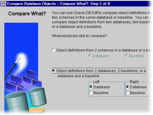 The Compare Database Objects wizard compares two sets of object definitions. The Compare Database Objects wizard can extract these object definitions from two sources: |