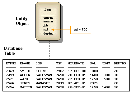 The following figure shows an Entity Object named Emp based on the EMP table. The developer of this Entity Object has also added a validation rule to specify that an employee's salary must be greater than 700.