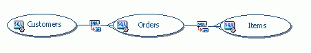 Business Components for Java can model more complex relationships involving multiple tables, as well. As the following figure illustrates, you could use View Links to define a one-many-many relationship between customers and orders, and orders and items.