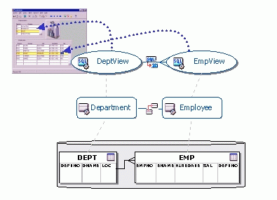 The following figure shows how Business Components for Java represent a master-detail relationship between the DEPT and EMP tables. It also shows how a client might use the objects to display linked data in a form.