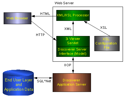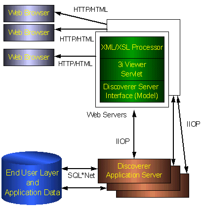The Oracle Discoverer 3i Viewer Edition Servlet interprets the HTTP request from the client browser, and makes the necessary calls to the Discoverer Application Server.