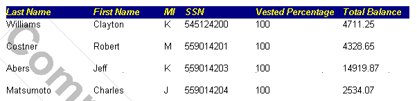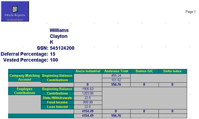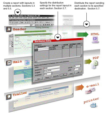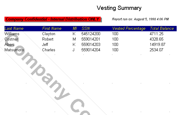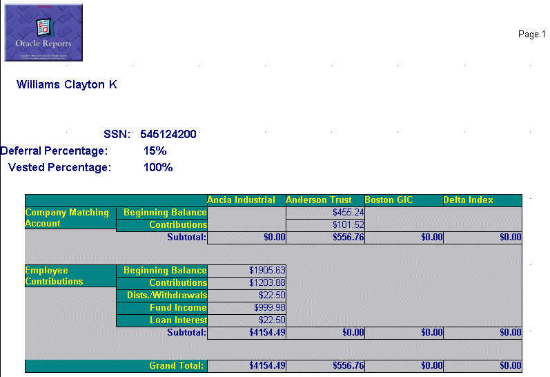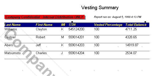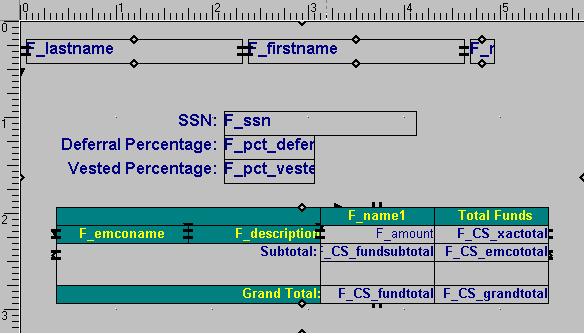 In this example, you will create a detailed report in the main section showing investment fund elections, and an account summary for employees vested at a specified percentage (one landscape page per employee). Then you will create one-page summary report in the header section of all employees vested at a specified percentage. Finally, you will set up distribution parameters to output each section of the report to multiple formats and destinations.